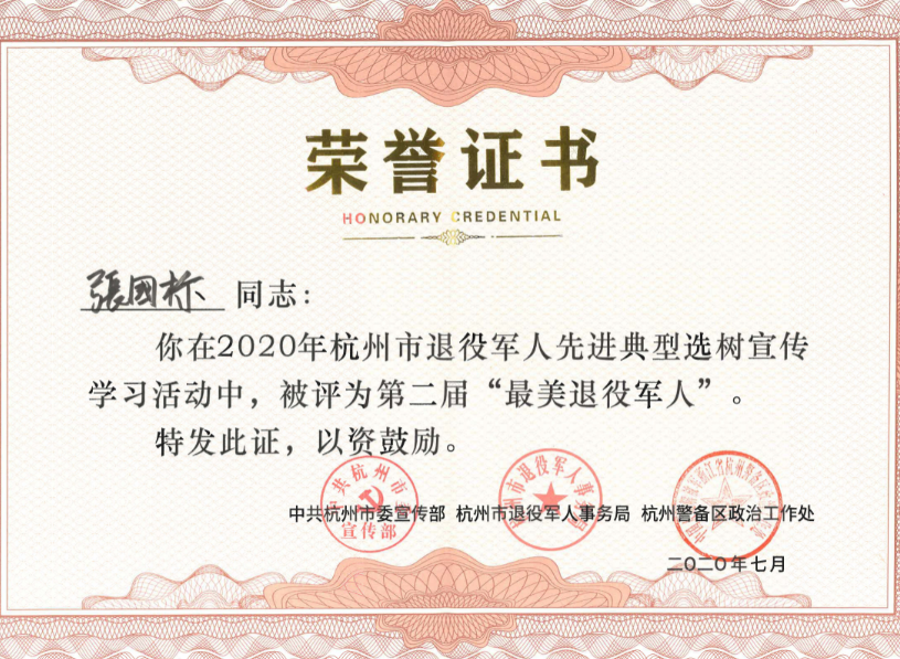 張國標董事長榮獲杭州市“最美退役軍人”稱號