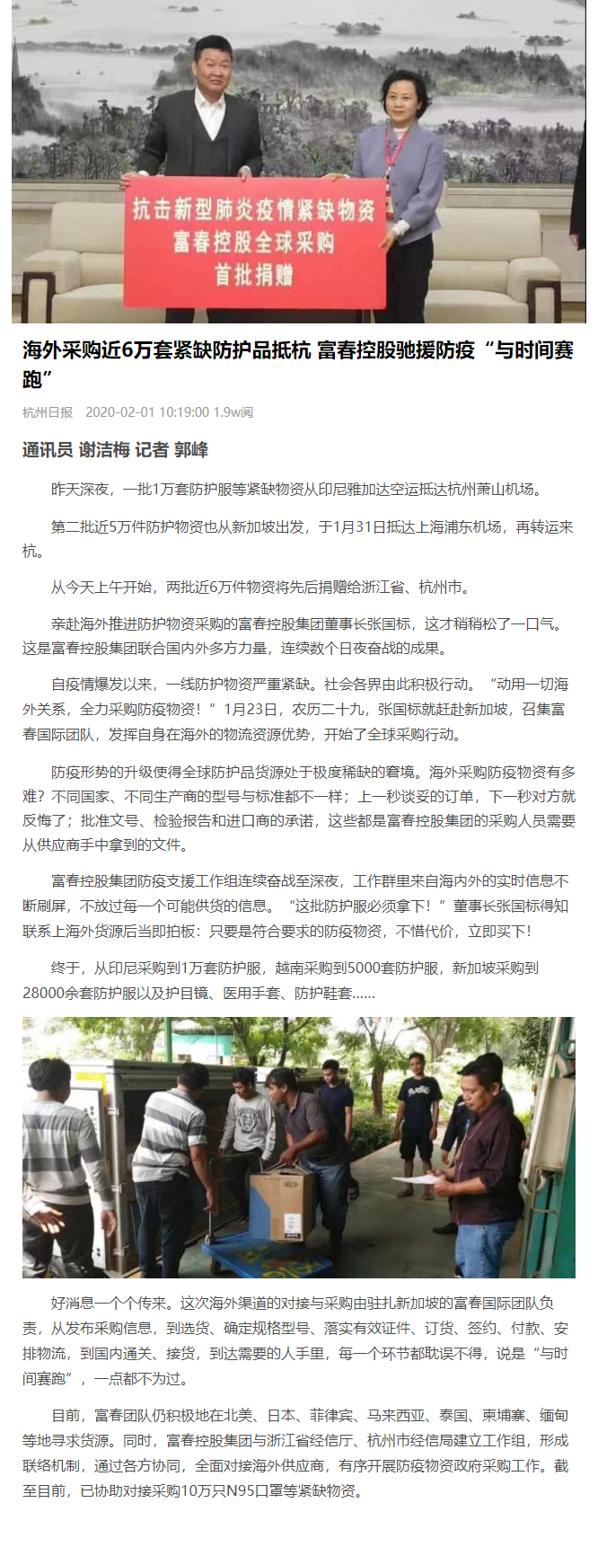 杭州日報:海外采購近6萬套緊缺防護品抵杭 富春控股馳援防疫“與時間賽跑”
