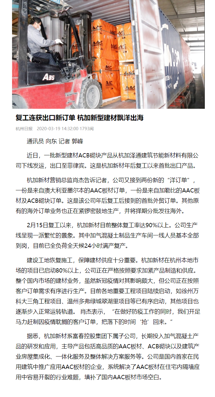 杭州日報:復工連獲出口新訂單 杭加新型建材飄洋出海