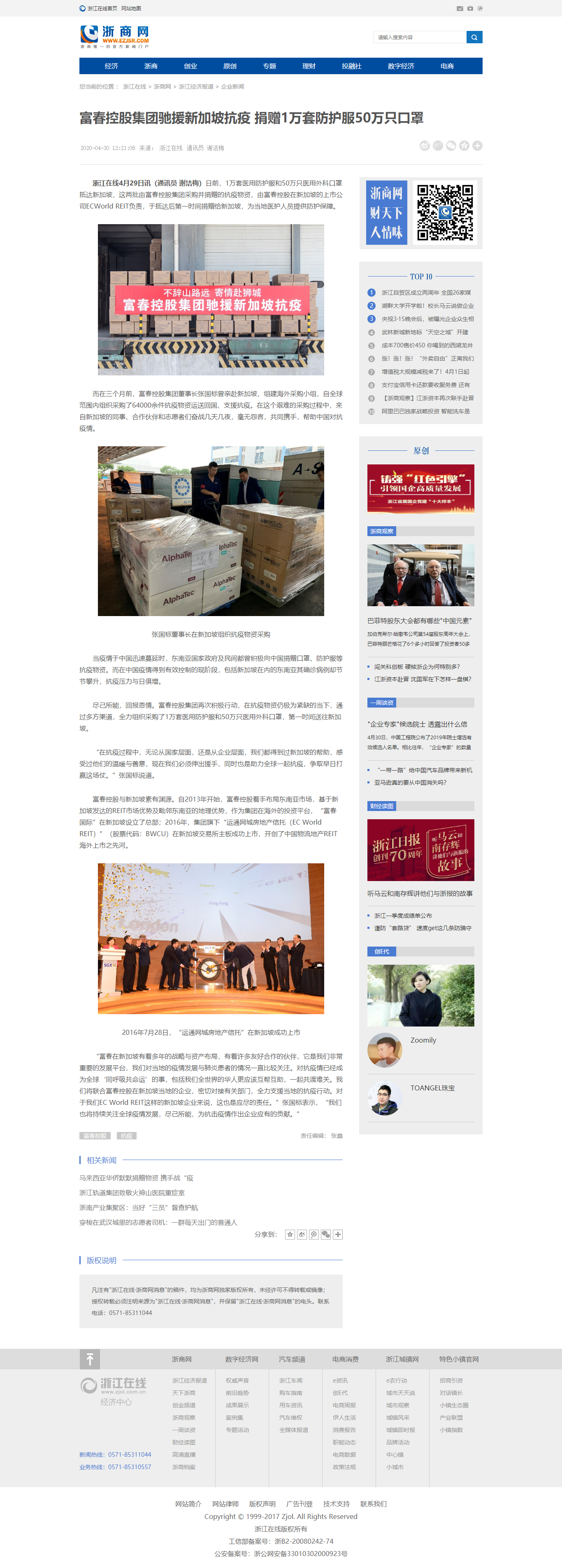 浙江在線:富春控股集團馳援新加坡抗疫 捐贈1萬套防護服50萬只口罩