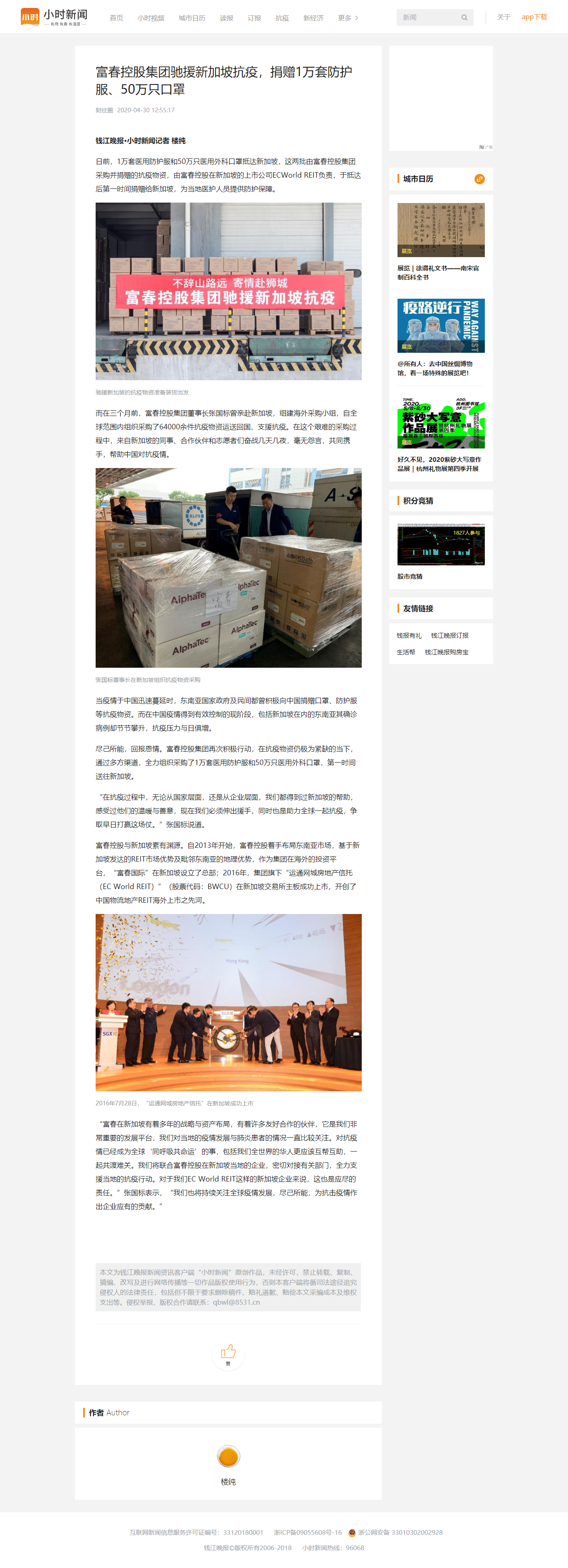 錢江晚報:富春控股集團馳援新加坡抗疫,捐贈1萬套防護服、50萬只口罩